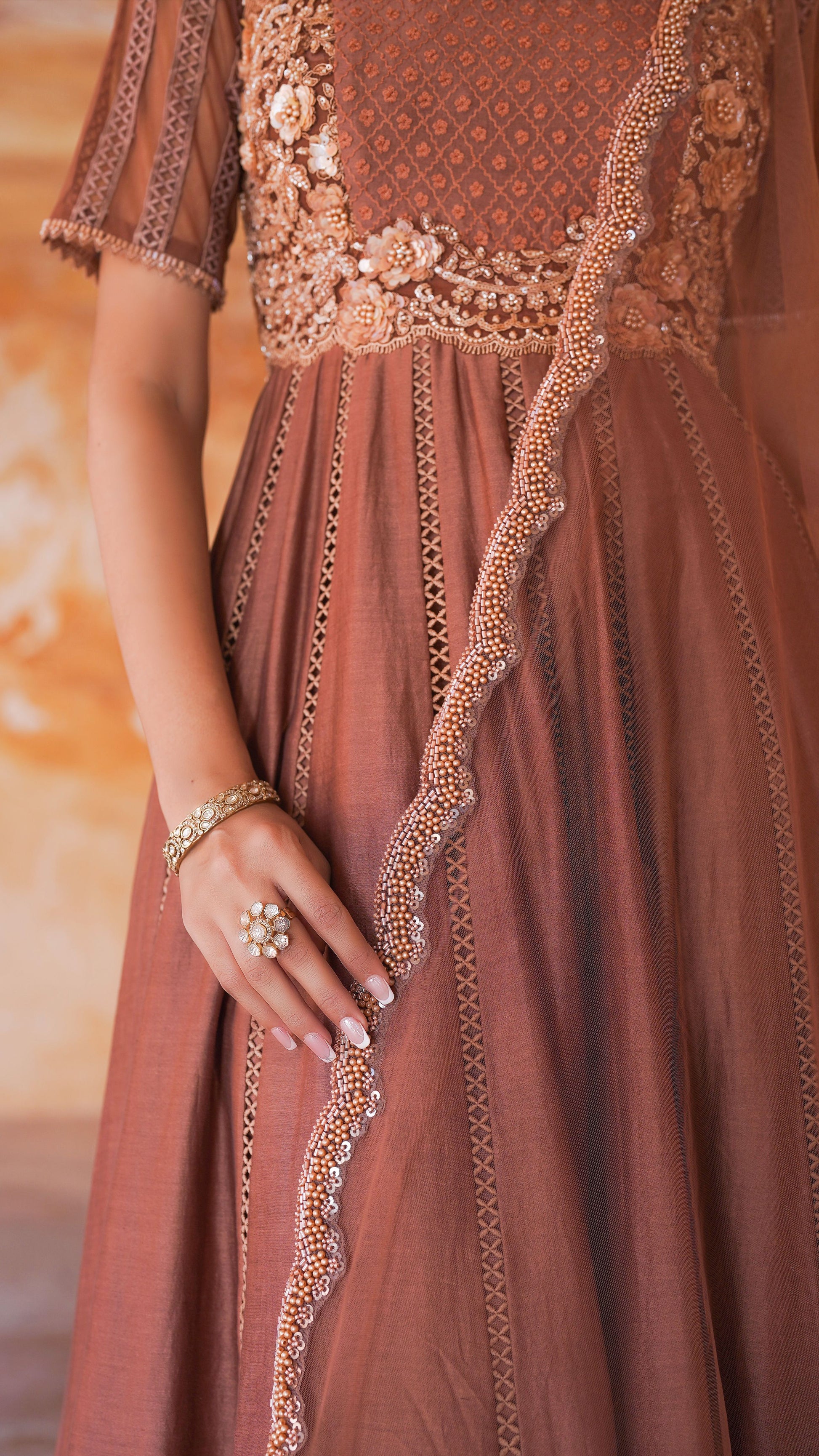 Elegant brown Anarkali set crafted in luxurious Chanderi silk. The flared Anarkali paired with a beautiful sheer net embellished dupatta, making this hand-embroidered ensemble perfect for a sophisticated, modern wedding or celebratory event.